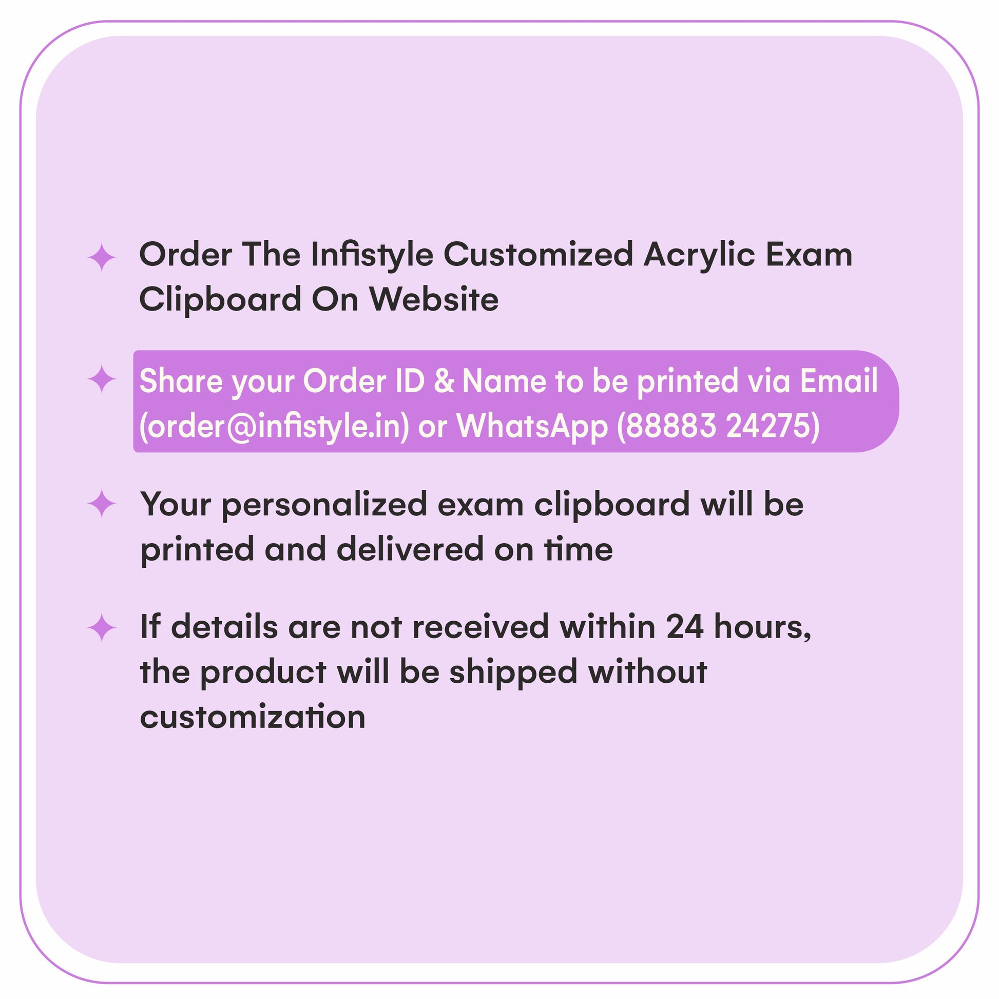 Delivery timelines depend on location and order quantityOnce your order is confirmed, we will process and ship it across India. As these are Customised exam boards with names are made to order, the production timeline is 4 to 7 days after your design approval. Once dispatched, delivery generally takes up to 7 days, depending on your location. Please note that express delivery is not available.