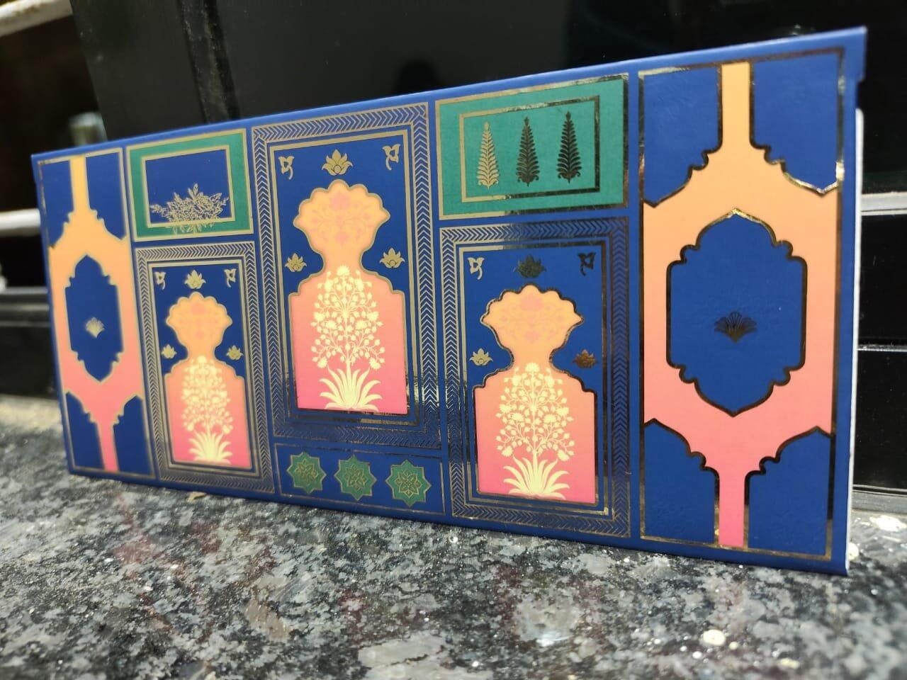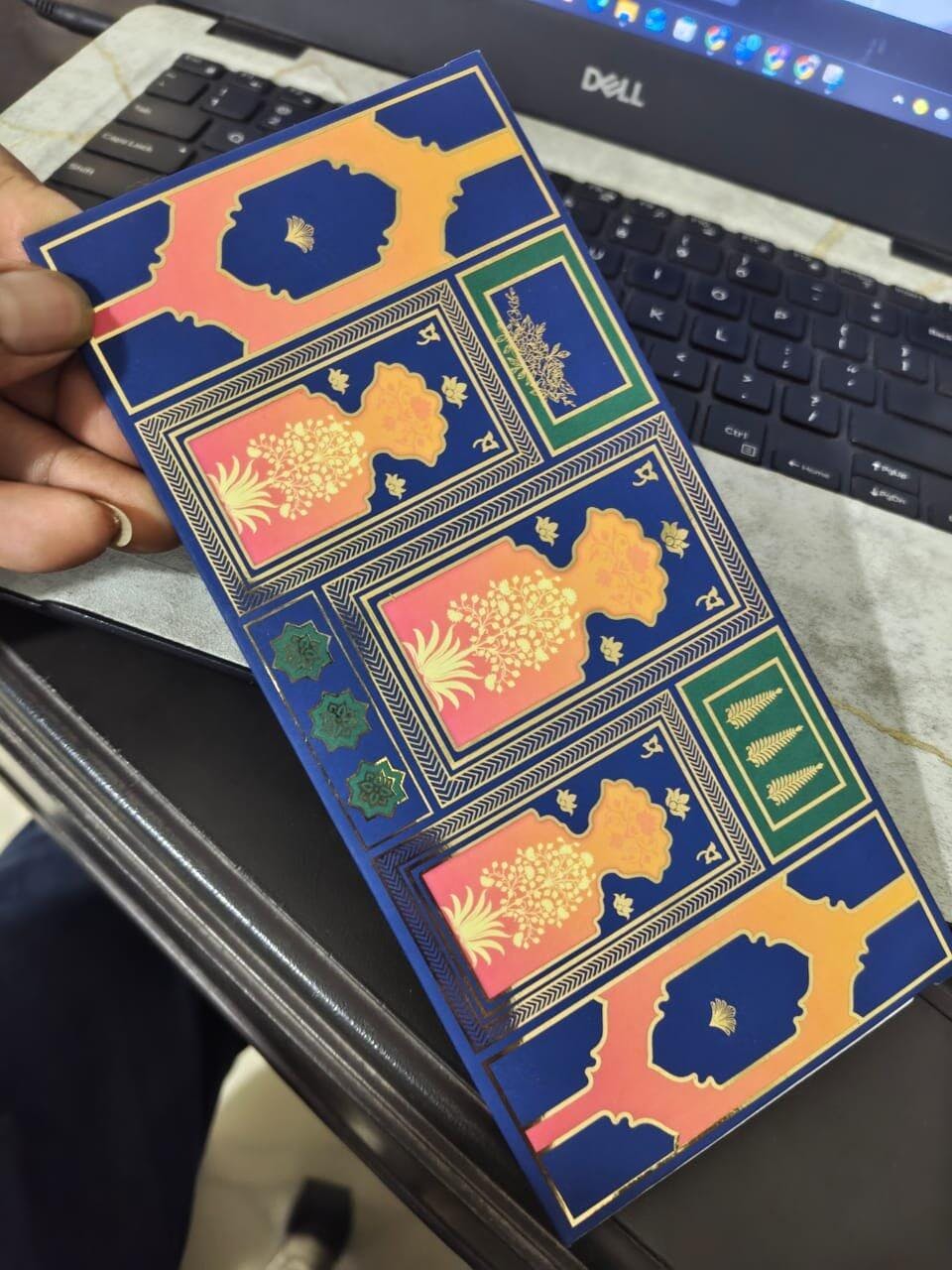 This elegant money envelope features a rich navy blue background adorned with intricate gold foil motifs. The design, inspired by classic Indian aesthetics, includes detailed patterns and elegant frames, making it a perfect choice for weddings, festivals, or any special occasion where a touch of luxury is desired. The soft peach and green accents complement the gold and blue, creating a sophisticated and timeless look. Made from high-quality paper, this envelope is designed to impress and delight.