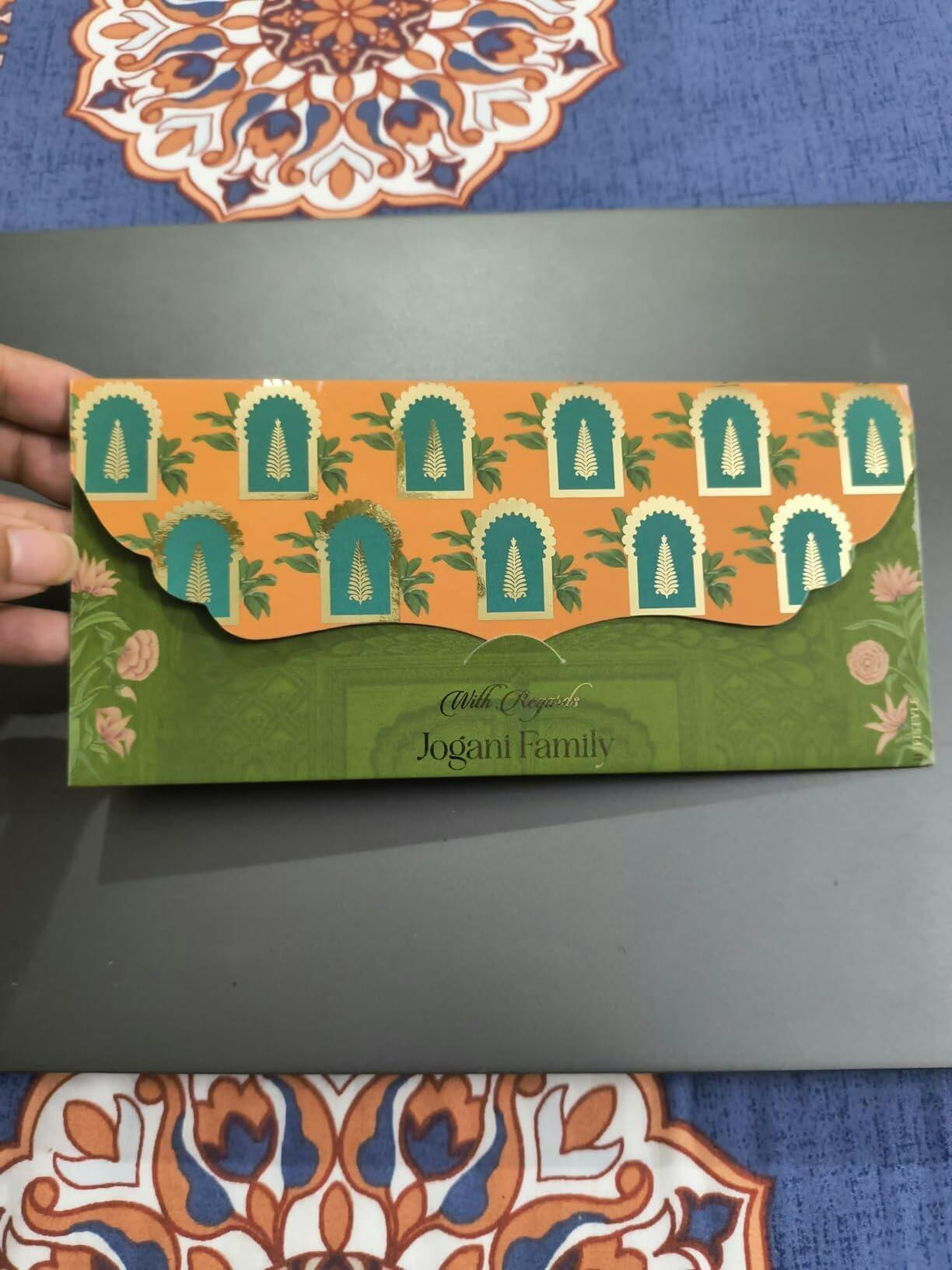 Crafted from 270 GSM thick cardstock and finished with a velvet-touch laminate, each envelope is accented with elegant gold foil personalization, giving your gift an exquisite and thoughtful appeal.