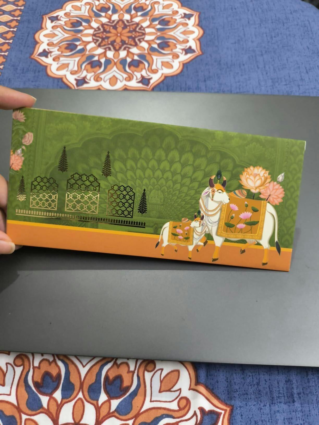 Make your special occasions unforgettable with our Traditional Green Shagun Envelopes, featuring intricate Pichwai-inspired sacred cow and lotus motifs. Designed to blend cultural heritage with luxury, these envelopes are ideal for weddings, festive gifting, and ceremonial blessings.